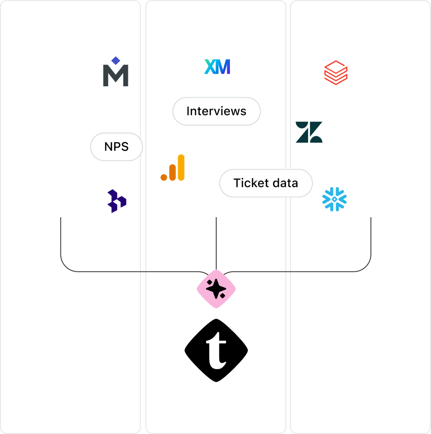 Bring together feedback, tickets, interviews, and metrics in one shared model structured by journeys.